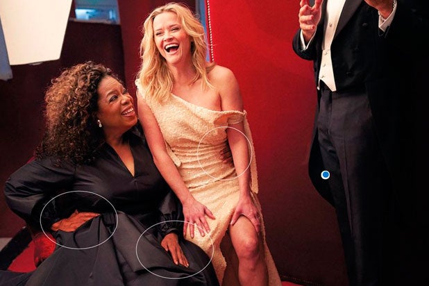 La célebre presentadora y la actriz Reese Witherspoon fueron las protagonistas de un insólito error de 'photoshop' en la reciente edición de la revista.