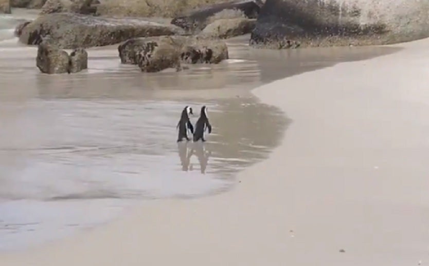 Un video está dejando sin aliento a muchos por la ternura de su contenido. Una mujer publicó en su cuenta en Twitter una grabación hecha en una playa de Sudáfrica en la que aparecen dos pingüinos caminando por la orilla del mar.