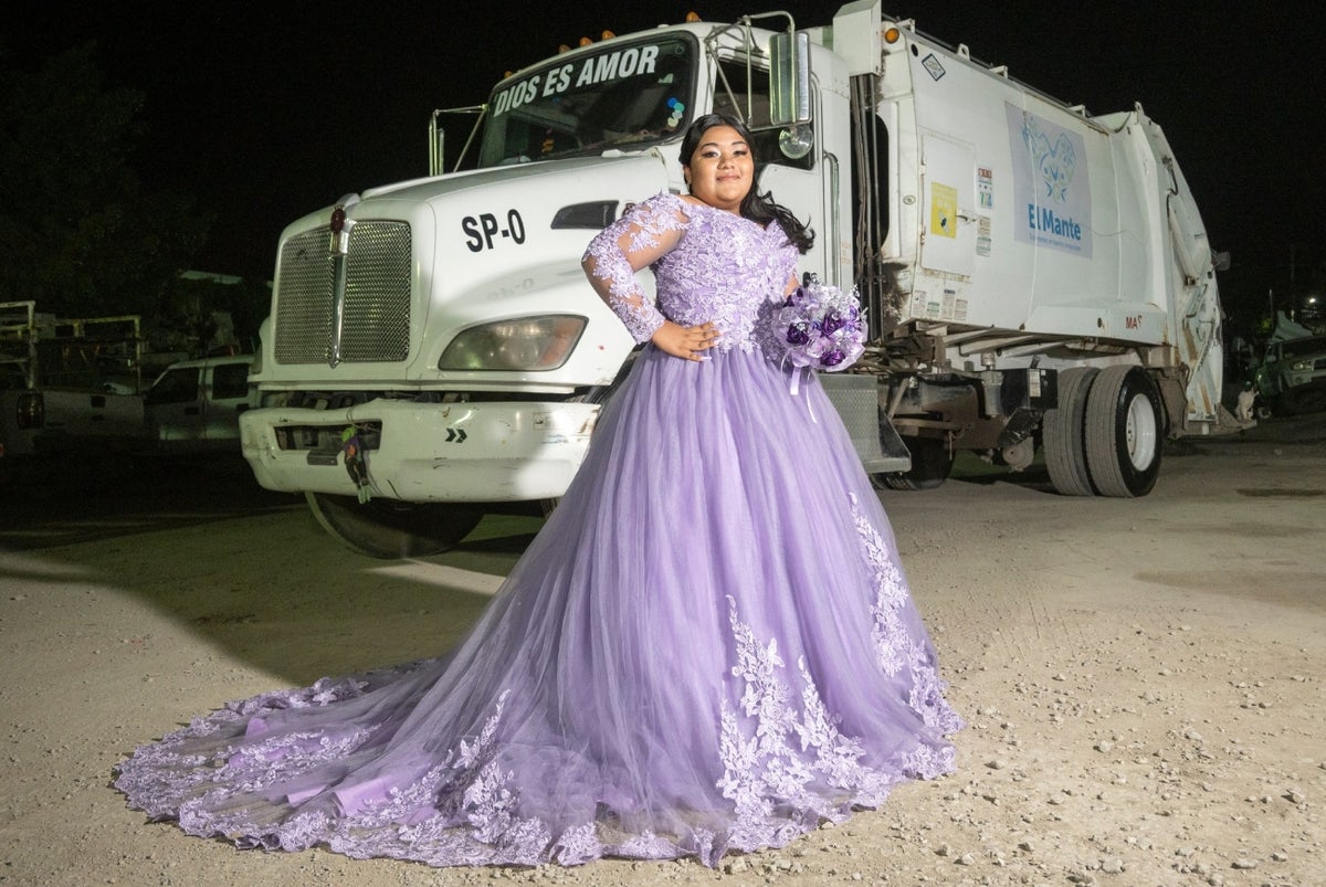 La joven cumpleañera deslumbró a todos luciendo un hermoso vestido de quinceañera en tono lila y encaje, el cual combinó con un ramo de flores en el mismo tono, incluso el fotógrafo realizó una edición en el camión de basura que también fue protagonista en las fotografías.