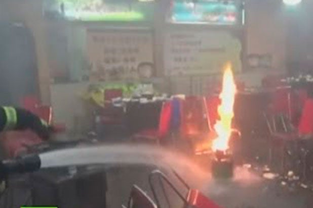 En equipo tuvo que realizar un arriesgado operativo, para lograr sacar un tanque de gas que se incendió al interior de un restaurante en Tongren, ciudad ubicada al suroeste de China.