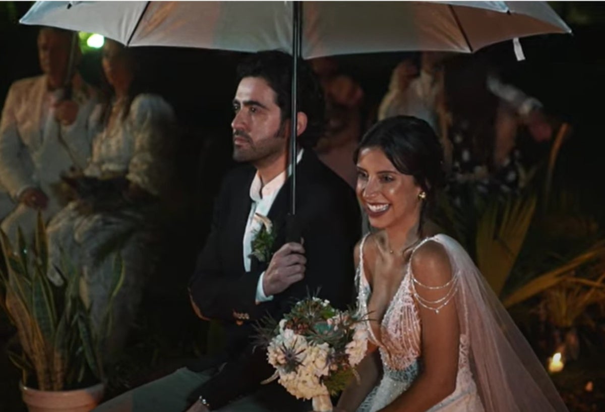 También se ve el momento particular que tenía al exvocalista de Bonka con los pelos de punta. La lluvia los puso a padecer un buen tiempo y definitivamente, viendo que no pararía el agua, decidieron celebrar la ceremonia en medio de este fenómeno natural, usando sombrillas mientras cada uno le ponía el anillo al otro.
