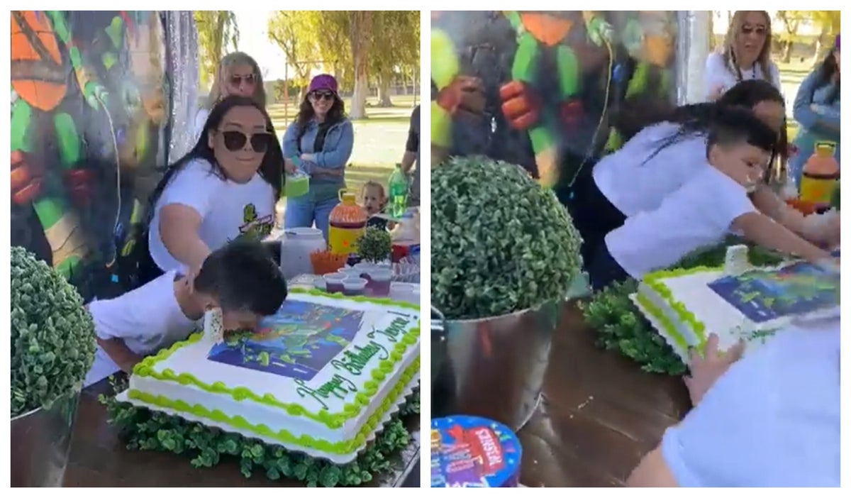 En los últimos días se viralizó el video en el que se ve cómo el pequeño festejaba su cumpleaños número cuatro en lo que pareciera ser un parque. Al momento de agacharse para darle una mordida al pastel, se acerca por atrás su mamá y lo empuja directo contra la torta, de tal forma que su cara queda llena de dulce.