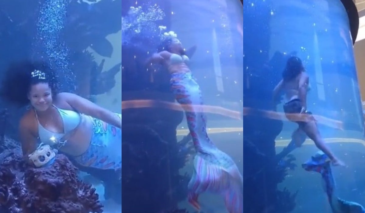 En las imágenes que ya le han dado la vuelta al mundo a través de redes sociales, se puede ver que la nadadora estaba haciendo su show en una instalación que simula un acuario, dentro de un centro comercial en Cresta, Sudáfrica, frente a varias personas, entre ellas, muchos son niños.