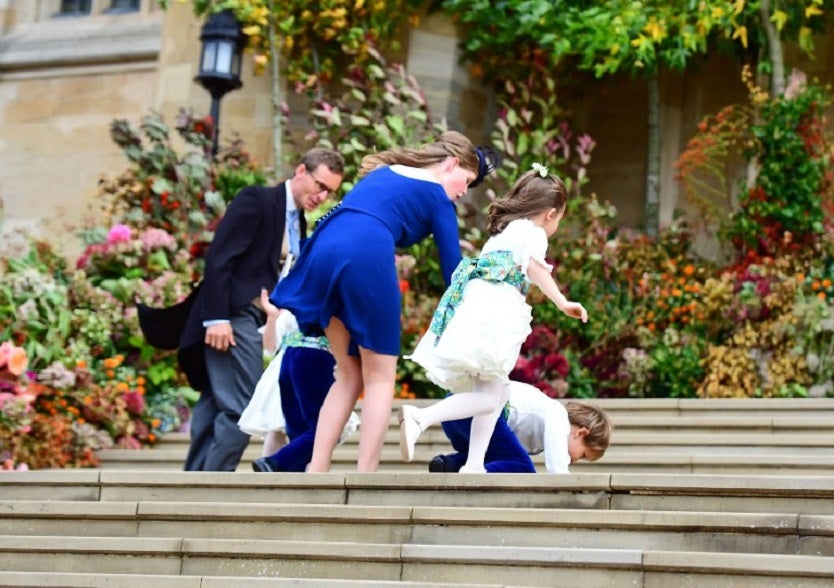 Al subir las largas escaleras que llevan hasta la entrada de la capilla de San Jorge del castillo de Windsor, uno de los niños se tropezó y cayó, a lo que ella se agachaba para ayudarlo. Y es entonces cuando el viento sopla fuerte y levantaba su vestido de tonalidad azul, dejando su ropa interior al descubierto por completo.