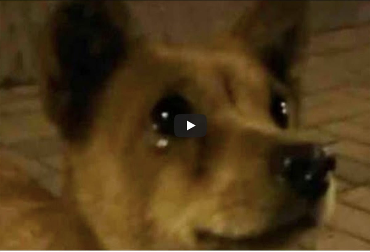 Al recibir la salchicha, se ve al canino con sus ojos llenos de lágrimas y muy emocionado por recibir algo de alimento.