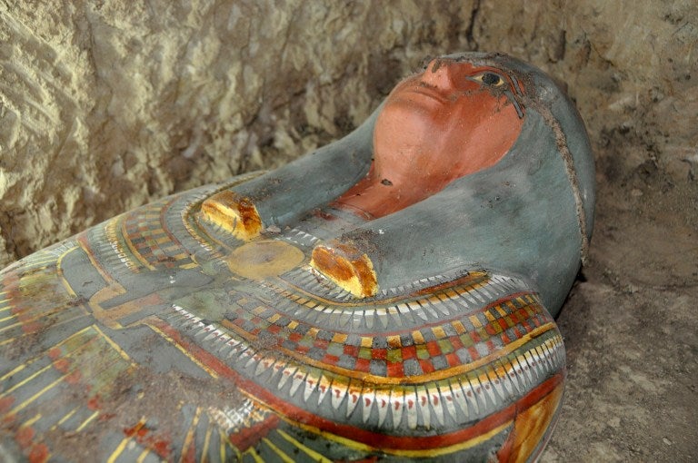 El enyesado de la momia "presenta muchas decoraciones coloridas que retoman símbolos religiosos de Egipto antiguo, como las diosas Isis y Neftis desplegando sus alas, o los cuatro hijos de Horus", según la jefe de la misión arqueológica, Myriam Seco Álvarez.