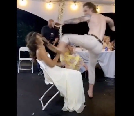 En un intento por sorprender aún más a su amada, el novio inicia a hacer un movimiento pasando su pierna por encima de su esposa; sin embargo, la habilidad de su cuerpo no le permitió que fuera exitosa esta maniobra y terminó ocasionándole un gran golpe en la cara a la recién casada.