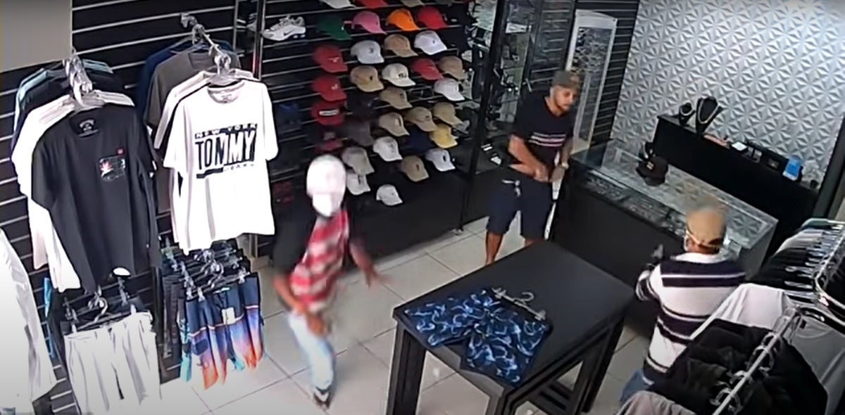Los hechos quedaron grabados en la cámara de seguridad del lugar y en las imágenes se ve a los tres hombres cuando llegaron al lugar y fingen ser clientes interesados en gorras, camisetas y pantalonetas.