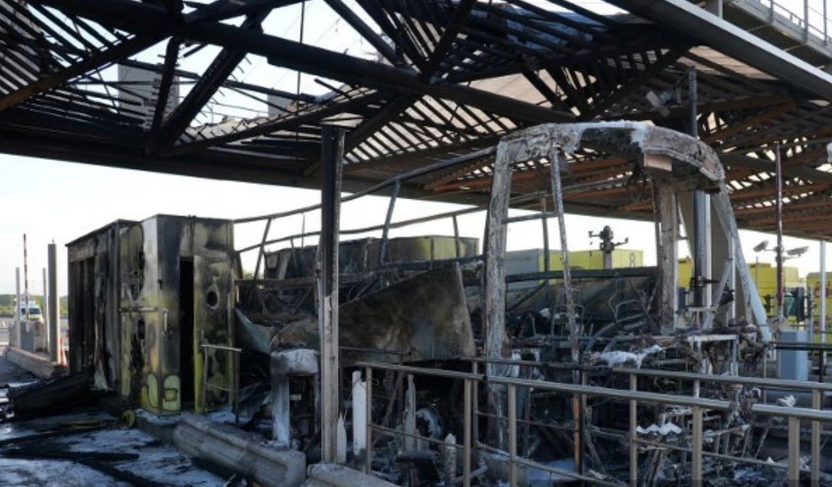 Las imágenes muestran el autobus totalmente quemado, dejando únicamente la estructura del chasis y las latas laterales. Además el peaje se vio afectado por este enfrentamiento, dejando al rededor escombros del techo y las casetas.