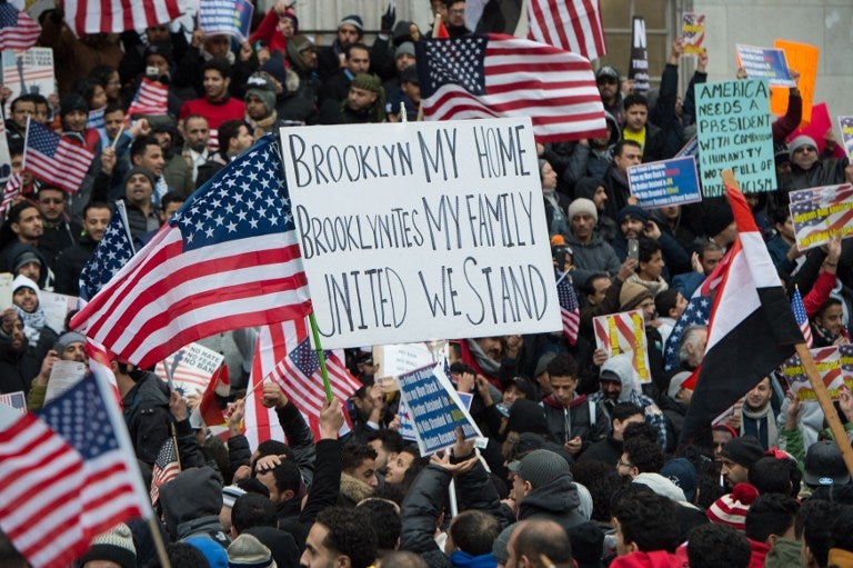 La multitud se apretujó en las escalinatas de la municipalidad del distrito de Brooklyn, agitando banderas estadounidenses y alguna de Yemen, así como carteles con consignas como "Las vidas de los musulmanes importan" (Muslim Lives Matter).
