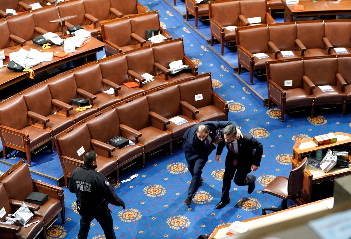 "Responsables de seguridad de la Cámara y la policía del Capitolio tienen sus armas desenfundadas mientras manifestantes golpean la puerta principal de la Cámara", tuiteó el legislador demócrata Dan Kildee desde el interior del Congreso. "Se nos ha indicado que nos tumbemos en el suelo y nos pongamos máscaras antigás", dijo.