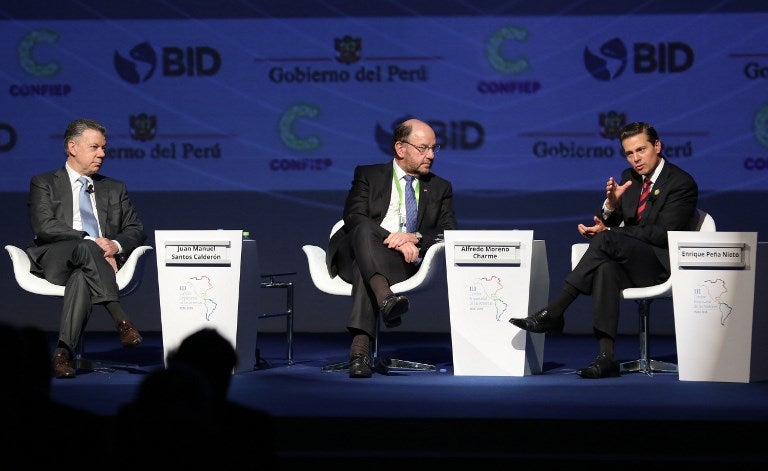 Los mandatarios Evo Morales (Bolivia), Juan Manuel Santos (Colombia), Enrique Peña Nieto (México), Sebastián Piñera (Chile), el anfitrión Martín Vizcarra (Perú) y el primer ministro de Canadá Justin Trudeau, participaron en la III Cumbre Empresarial, antesala de la Cumbre de las Américas que se inicia esta noche con una cena oficial en la presidencia peruana.