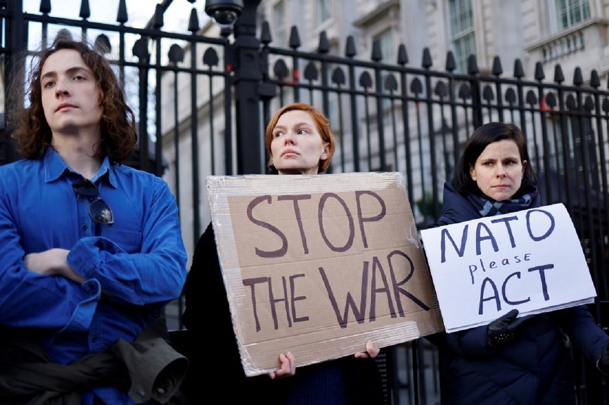 Manifestantes sostienen pancartas que dicen "OTAN, por favor, actúe" y "Alto a la guerra" en una manifestación frente a las puertas de Downing Street, en el centro de Londres. Crédito: AFP