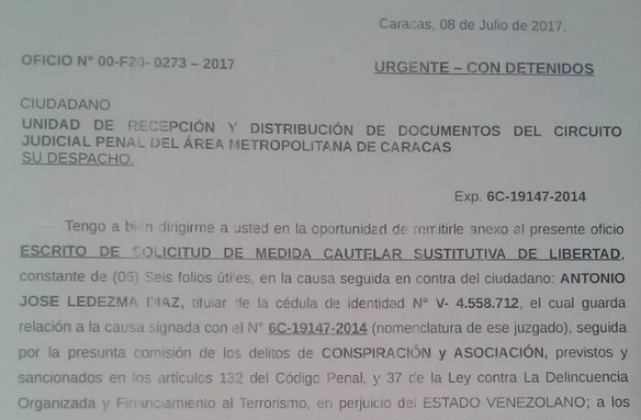 En su cuenta de Twitter, el Ministerio Público (MP) difundió tres documentos en los que solicita "medida cautelar sustitutiva de libertad" para los tres opositores, dirigidos a la Unidad de Recepción y Distribución de Documentos del Circuito Judicial Penal de Caracas.