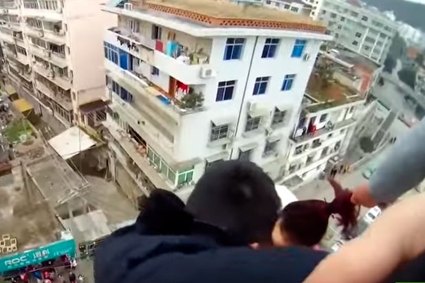 En el video se observa como una mujer de chaqueta rosada cuelga de un edificio de por lo menos cuatro pisos en AnKang, China, sujetada solamente por el cabello, pues su marido, quien intentaba no dejarla suicidar, se aferró de éste justo en el momento en que ella descendía.