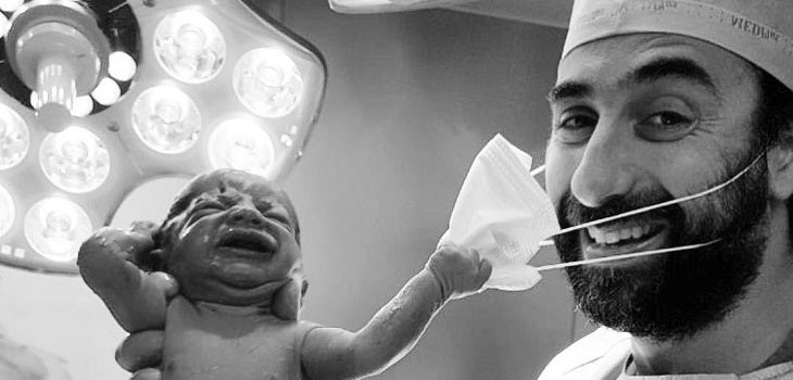 La imagen fue tomada por el papá de dos gemelos durante el parto en Dubai, Emiratos Árabes, y en medio de la difícil situación que vive el mundo a causa de la pandemia del coronavirus. La foto captó el momento exacto en que el recién nacido le quita el tapabocas al doctor Samer Cheaib y deja al descubierto su enorme sonrisa.
