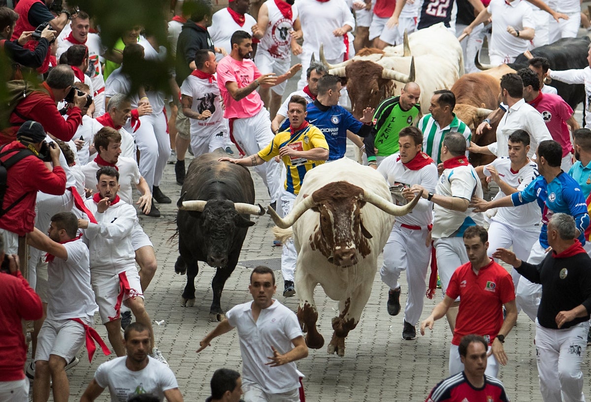 Durante una semana, cada mañana a las 08H00 (06H00 GMT) centenares de 'mozos' ataviados de camisa y pantalón blancos y con un pañuelo rojo al cuello corren delante de los toros por el centro de Pamplona, después de encomendarse a la imagen de San Fermín.