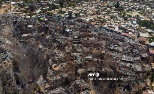 Casas quemadas tras incendio en Valparaíso, Chile. Crédito: AFP