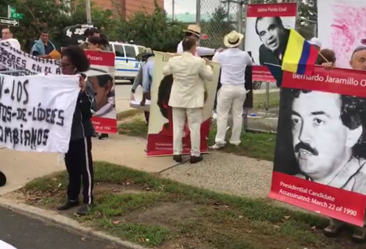 A las afueras del auditorio en Nueva York, Estados Unidos, en donde se desarrolla el Taller Construyendo País, se registró una manifestación de colombianos exigiendo al presidente Iván Duque resultados frente a los asesinatos que se han registrado en contra de líderes sociales.