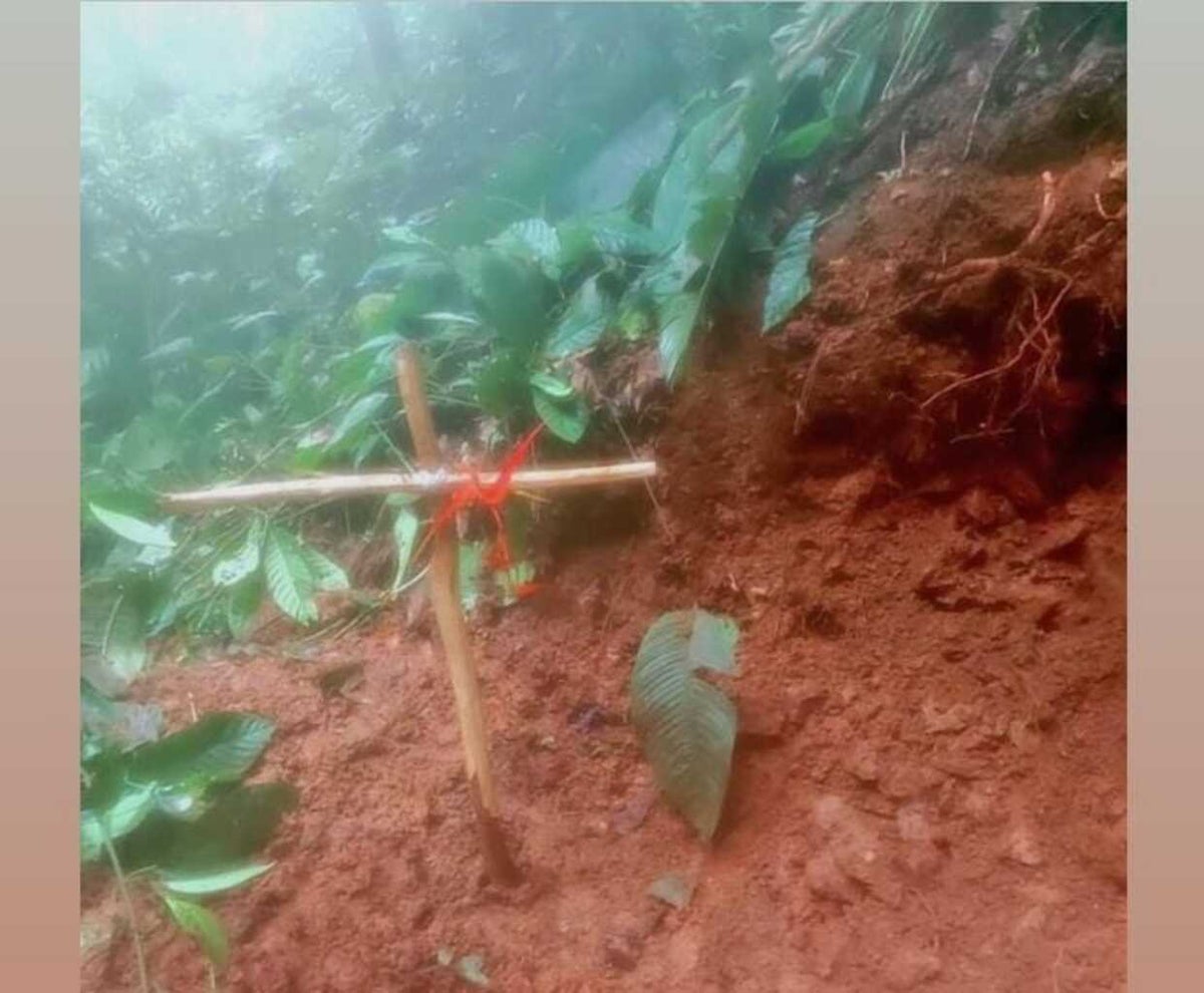 Una cruz hecha con dos palos de árboles fue puesta encima del lugar donde fue enterrado el migrante de 14 años que murió, al parecer, por un infarto, al intentar cruzar la selva del Tapón del Darién.