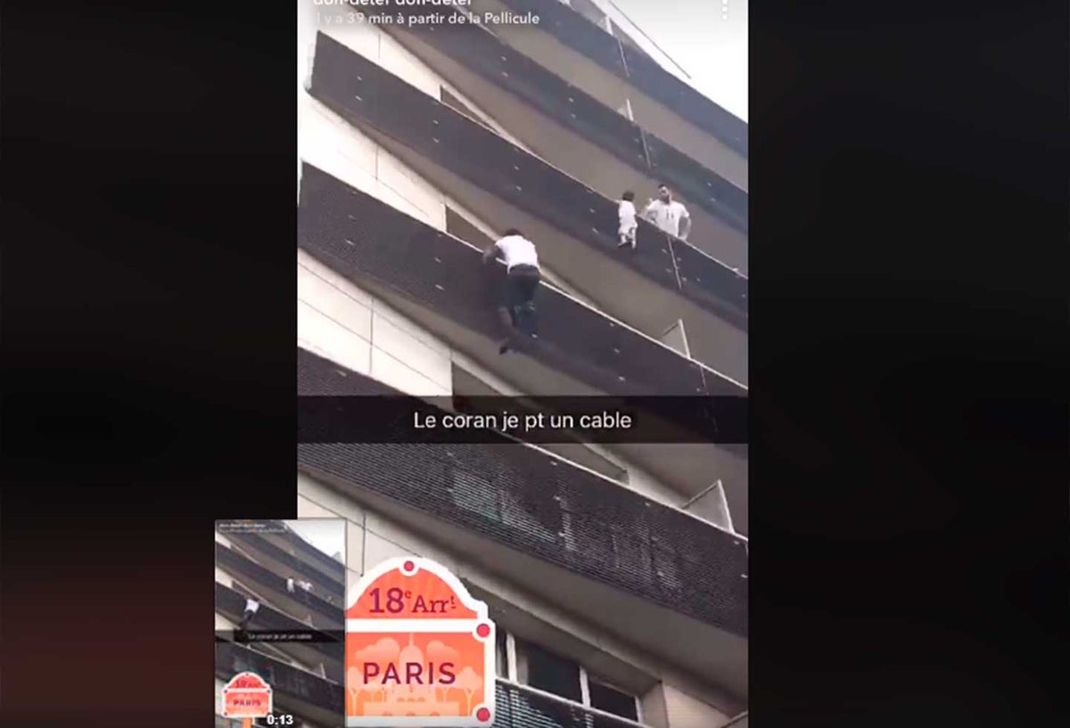 El suceso, espectacular, grabado y difundido por las redes sociales, muestra a un joven escalar a mano limpia y en treinta segundos cuatro balcones de la fachada de un edificio para llegar al cuarto piso, recuperar al niño suspendido y ponerlo en seguridad.
