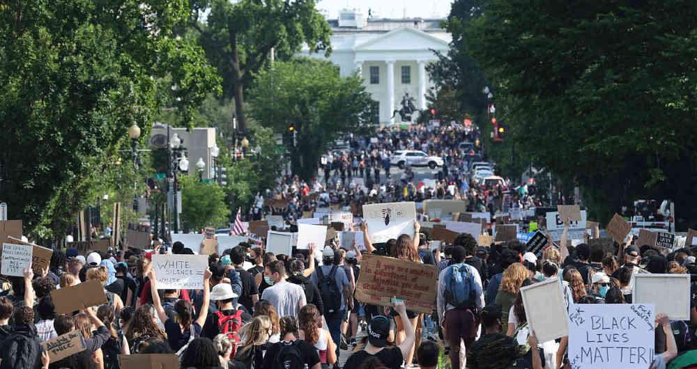 Miles de personas manifestando de cerca, gritando sus demandas y tosiendo cuando son afectadas por gases lacrimógenos. expertos temen que las protestas que se multiplican por Estados Unidos reaviven la propagación del coronavirus, un riesgo que muchos están dispuestos a correr "por la salud de la Nación".