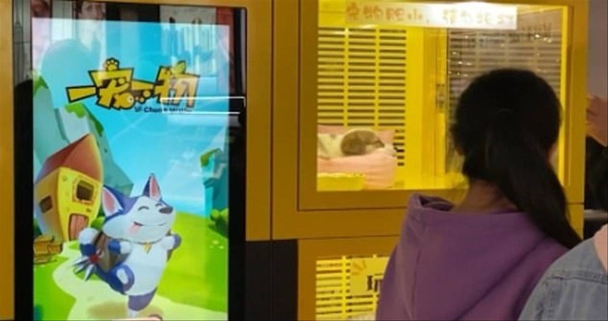 Polémica máquina en centro comercial encerraba cachorros de perro y gatos para darlos como premios