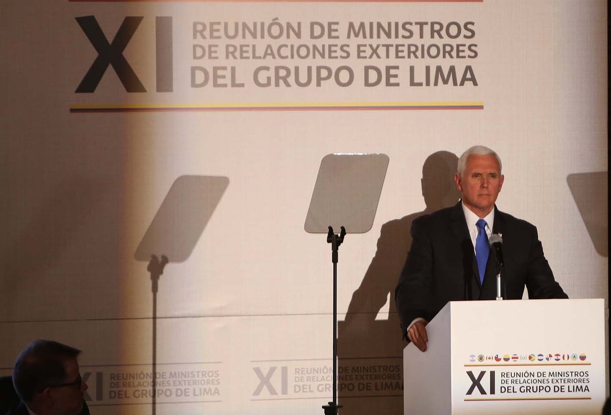 "Esperamos una transición pacífica hacia la democracia. Pero el presidente (Donald) Trump lo ha dejado claro: Todas las opciones están sobre la mesa", dijo Pence durante su intervención ante el Grupo de Lima, que se reúne en Bogotá para evaluar medidas que resuelvan la crisis venezolana.