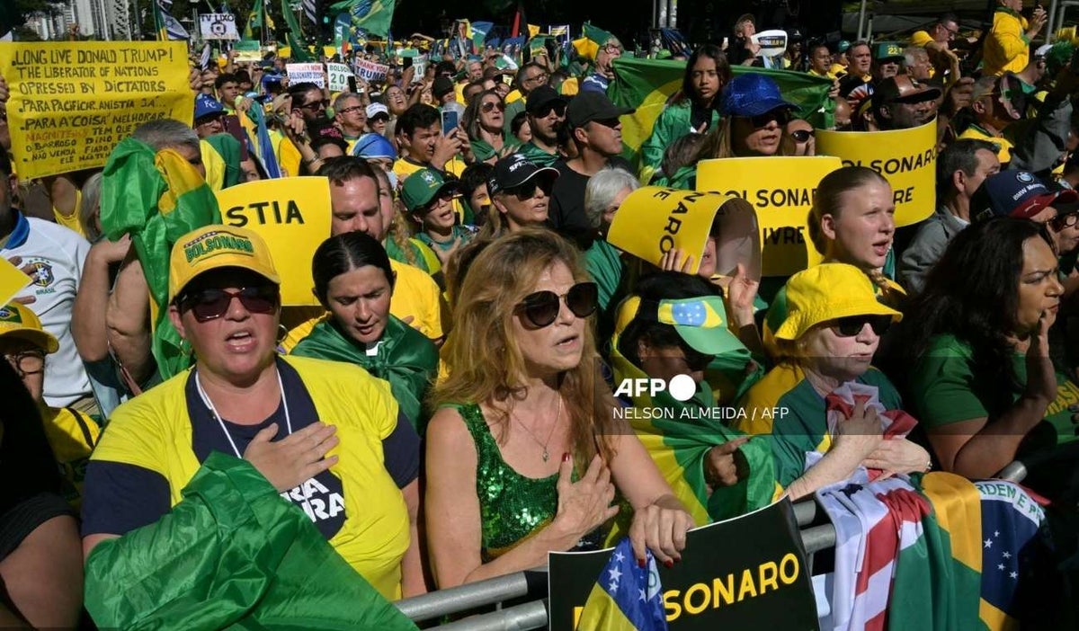 Manifestantes en Brasil apoyan a Bolsonaro en medio de críticas a Lula y De Moraes. Bandera de Brasil y EE.UU. presentes en las protestas. Crédito: AFP