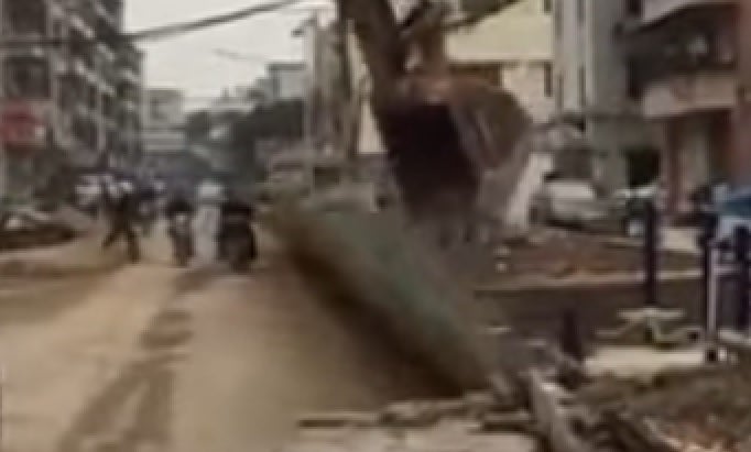 Cuando el motociclista avanzaba por la calle, una grúa derribó una pared que terminó por aplastarlo.
