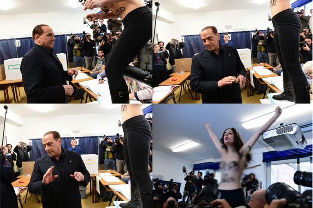 Una activista del grupo Femen sorprendió al ex primer ministro Silvio Berlusconi cuando se disponía a votar en un colegio de Milán (norte), en las elecciones generales que celebra este fin de semana Italia.