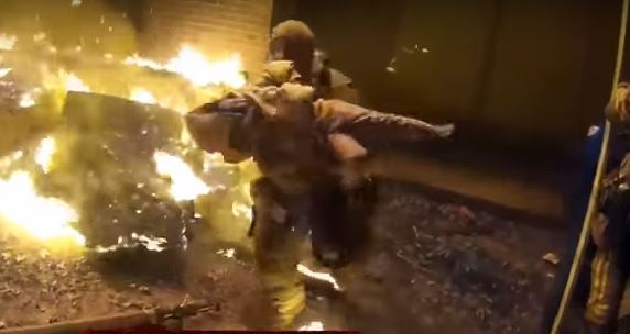 El increíble momento fue captado desde la cámara de un casco de uno de los bomberos.