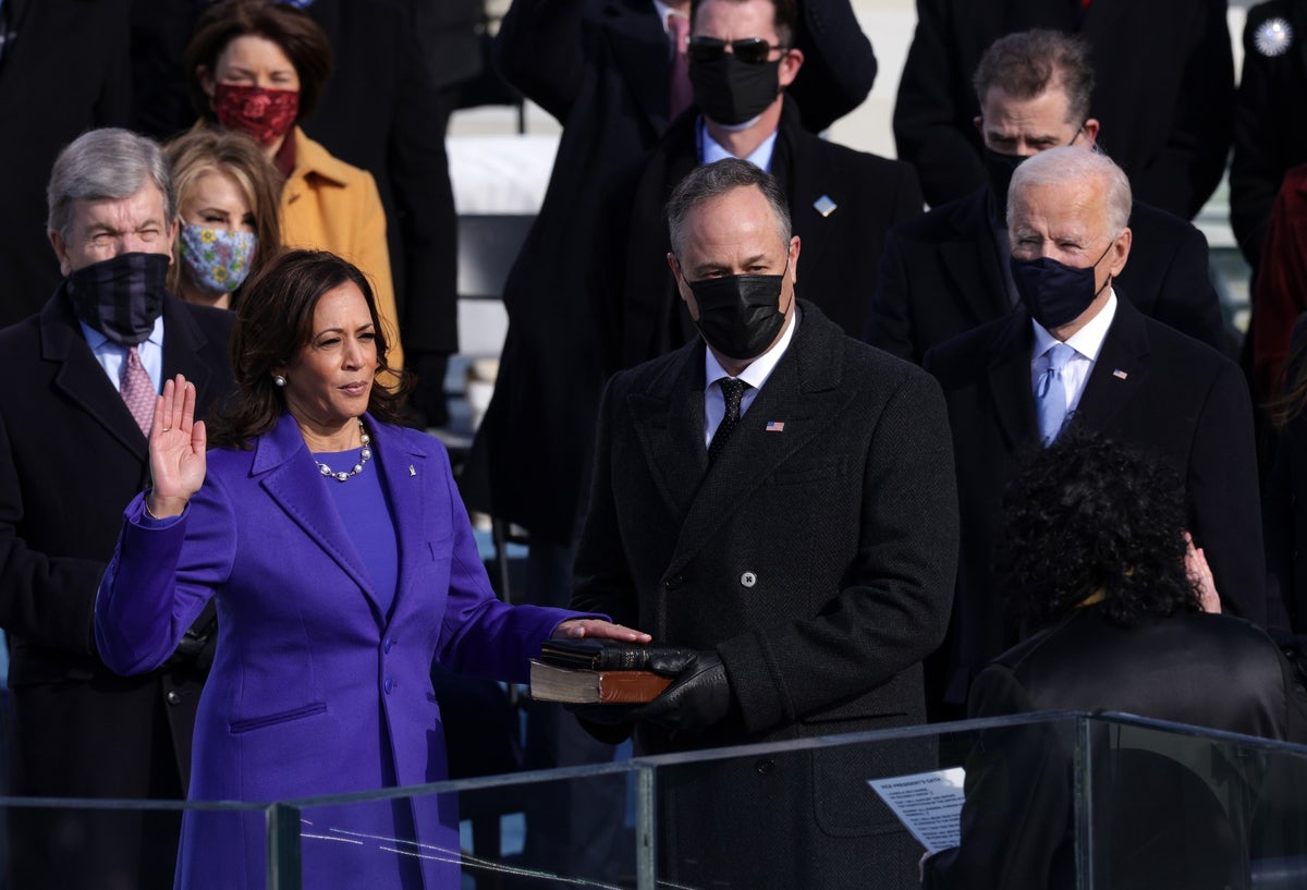 Harris, de 56 años, prestó juramento con una mano sobre la biblia ante la jueza progresista de la Corte Suprema Gloria Sotomayor, que fue la primera latina en ser elegida como magistrada del alto tribunal.