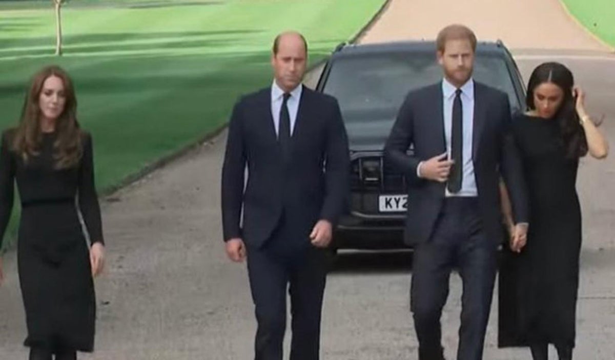 Los príncipes William (Guillermo) y Harry (Enrique) aparecieron este sábado con sus esposas Catalina y Meghan en el castillo de Windsor, donde contemplaron juntos las ofrendas florales a la reina Isabel II, fallecida el jueves.