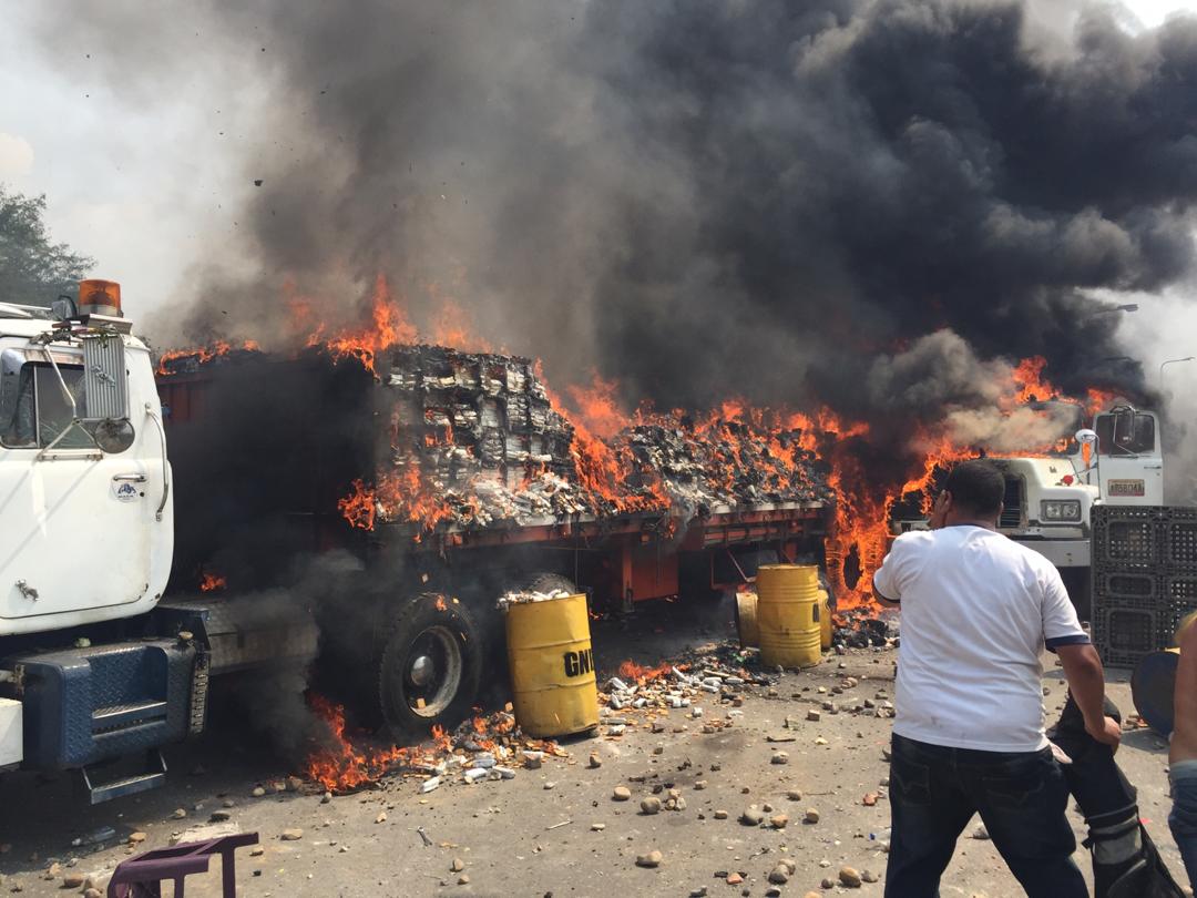 Dos camiones con cargamento de la ayuda humanitaria solicitada por la oposición fueron quemados hoy por la Policía Nacional Bolivariana en el lado venezolano del puente Francisco de Paula Santander, que conecta al país con Colombia, denunció más temprano la diputada opositora venezolana Gaby Arellano.