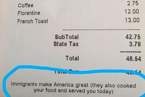 El mensaje que ha hecho imprimir en sus tickets de caja podría hacerle más famoso aun: "Los inmigrantes hacen la grandeza de Estados Unidos (y son también los que han preparado su comida y le han servido hoy)", se puede leer en las notas, parodiando el célebre eslogan de la campaña de Donald Trump.