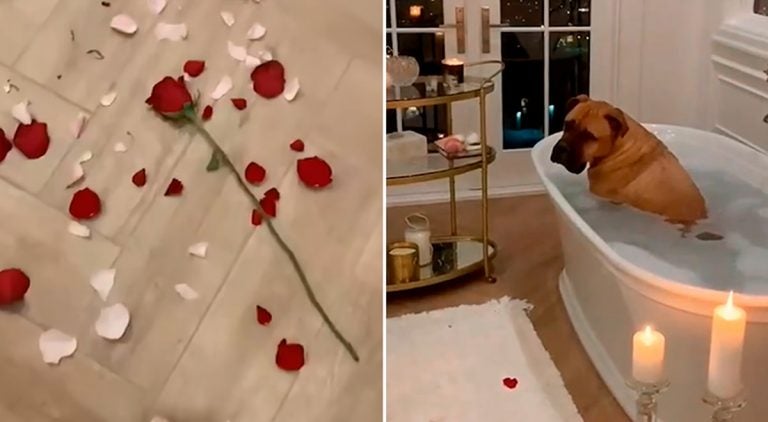 En la grabación se logra ver el detalle que quiso tener con su pareja. Se trataba de un camino de pétalos de rosas rojas y blancas que iniciaba desde la puerta hasta la tina, donde había preparado un baño de burbujas que estaría acompañado de las luces de las velas. Todo esto se preparó sin imaginar que su perro terminaría por adelantarse y convirtiéndose rápidamente en el protagonista de la cita.