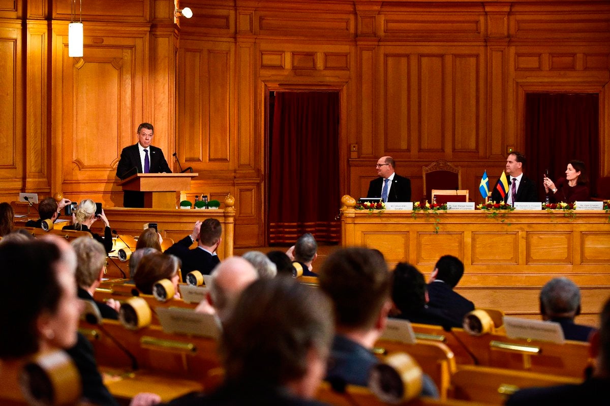 El presidente colombiano elogió el papel de Suecia en el proceso de paz y los vínculos históricos entre ambos países. Asimismo citó a Gabriel García Márquez -el único colombiano que había ganado un Nobel antes que él, el de Literatura en 1982- para decir que Colombia "se ha ganado una segunda oportunidad".