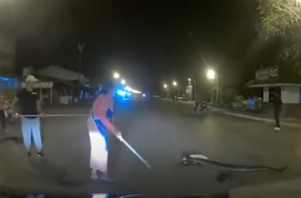 Armados de palos y con el valor de su fuerza, varias personas comenzaron a golpear a la víbora, que sólo cambió su atención hacia las personas cuando todo su cuerpo se giró, tras recibir un fuerte ‘patadón’.