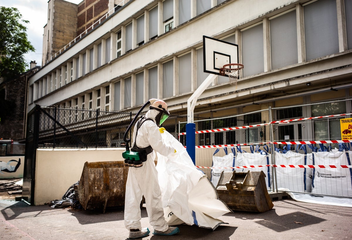 "La cubierta tiene un grosor de entre 4 y 5 centímetros a lo largo de 1850 metros cuadrados. La contaminación es superficial, por lo que el mejor método era retirarlo para instalar una nueva y que los niños puedan comenzar el curso dentro de las medidas sanitarias", explicó Mickael Prestavoine, director de la operación.