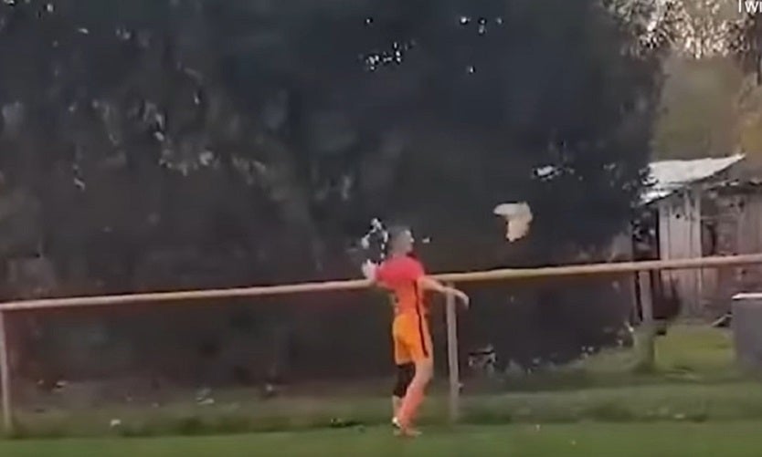 Ivan Gazdek, del equipo local NK Jelengrad, corrió detrás de las aves y dio varias patadas a uno de los pollos antes de lanzarlo por encima de una barrera en medio de una nube de plumas.