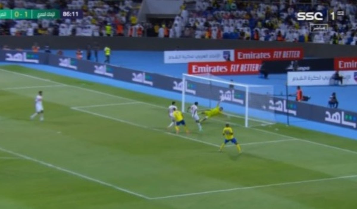 Pues al minuto 42 del segundo tiempo, Al Nassr generó una jugada interesante por el costado izquierdo, y luego de tres toques, se produjo un centro a media altura el cual encontró a Cristiano Ronaldo, quien se levantó y cabeceó al palo derecho, marcando así el 1-1.