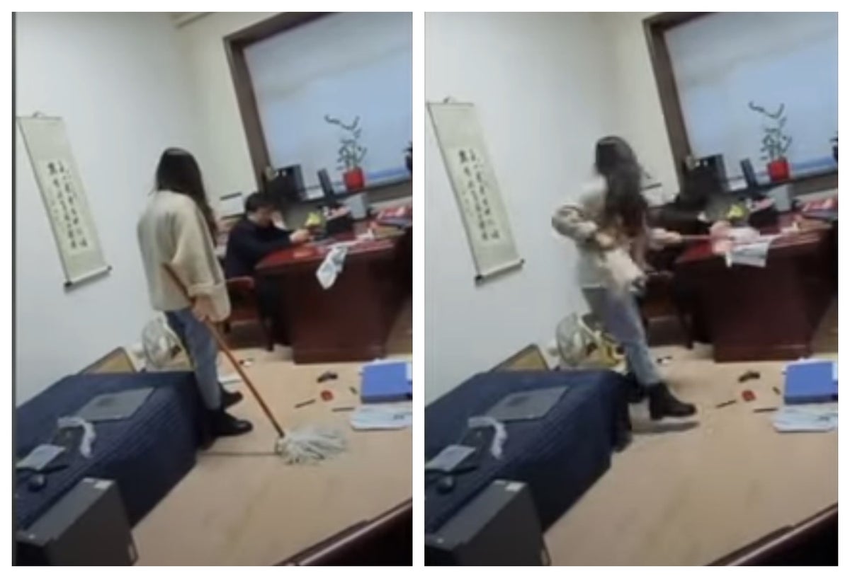Zhou trabaja para el Gobierno Chino y durante el vídeo se ve cómo la mujer coge el trapero y lo golpea, le lanza libros y agua al hombre, pero él no reacciona.
