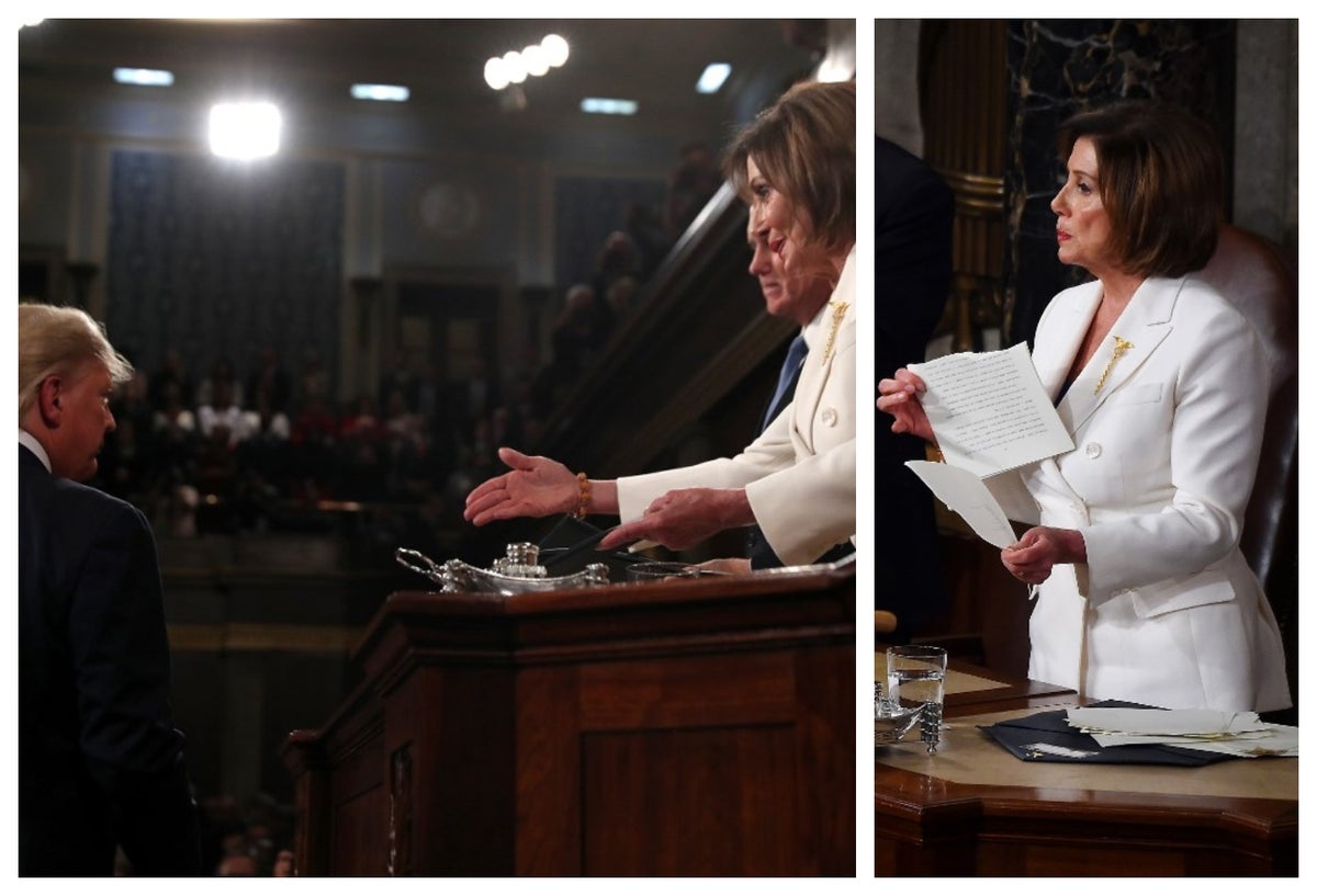 La presidenta de la Cámara de Representantes, que estaba ubicada detrás de Trump y junto al vicepresidente Mike Pence durante la ceremonia en el Capitolio, tomó el documento y lo destrozó de manera muy visible.