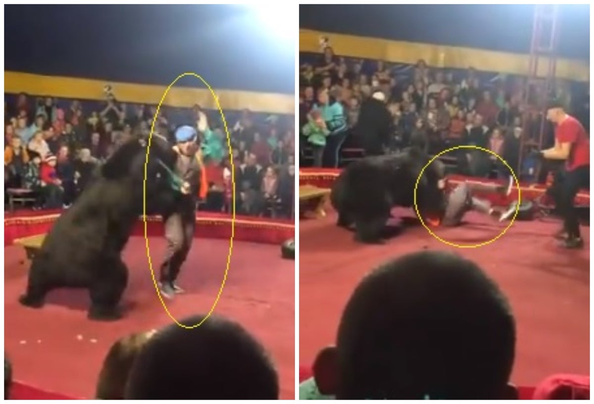 Se trata de una grabación que muestra el momento exacto en el que un oso pardo ataca a su domador en medio de una exhibición circense.