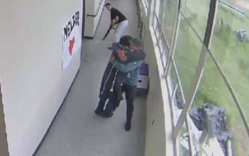 Tras quitarle la escopeta, el docente abrazó al joven para tranquilizarlo.