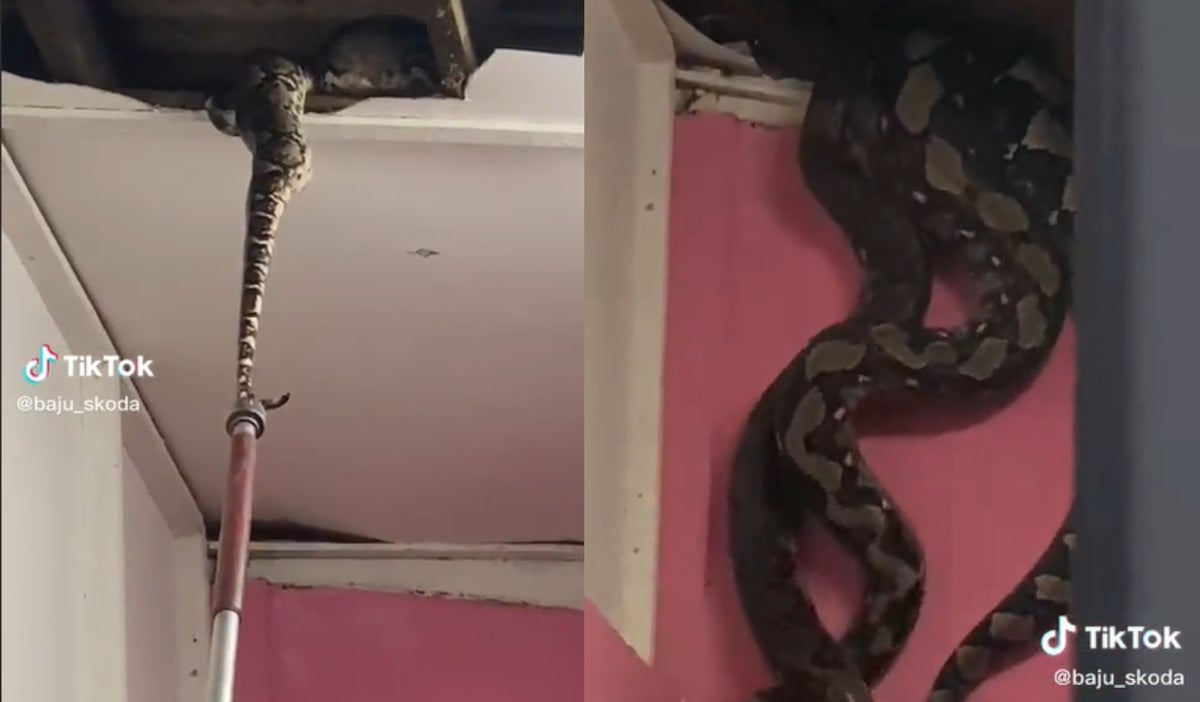 [Video] Terrorífico hallazgo de dos pitones gigantes en el techo de una casa