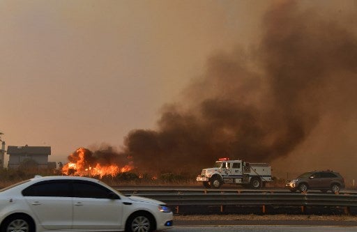 El incendio bordeaba la neurálgica autopista 405, la más transitada del país con unos 400.000 vehículos al día, donde los autos eran bañados la noche anterior por una lluvia de cenizas.