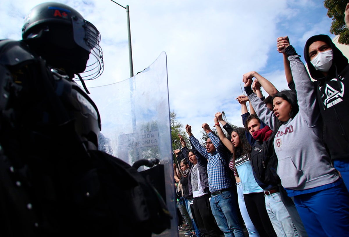 El Escuadrón Móvil Antidisturbios de la Policía (Esmad) y estudiantes universitarios, en el marco de las protestas en Bogotá Crédito: AFP