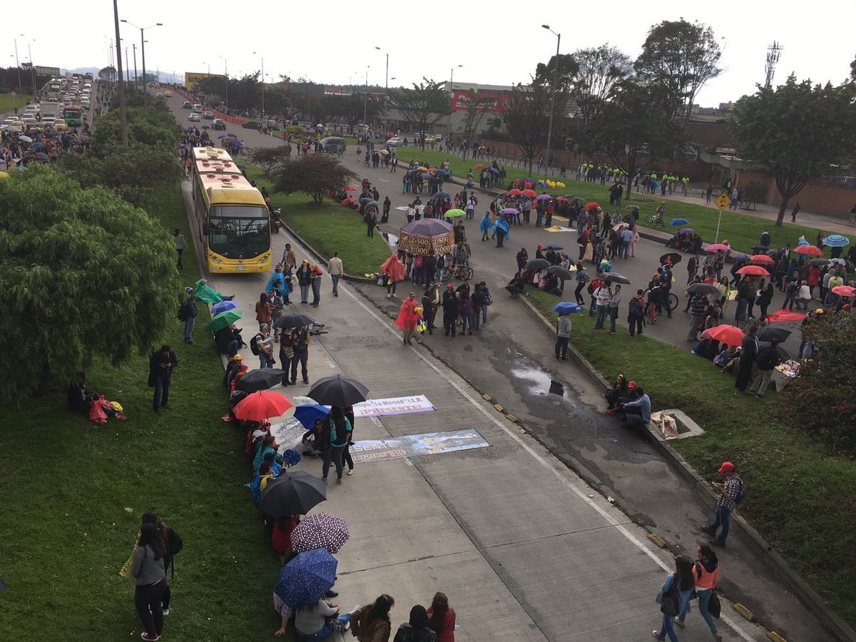 El portal sur de Transmilenio, el servicio de transporte masivo de la capital del país, se encuentra cerrado por las manifestaciones que se presentan en el sector en el marco del gran paro nacional que adelantan este martes diversos sectores estatales.